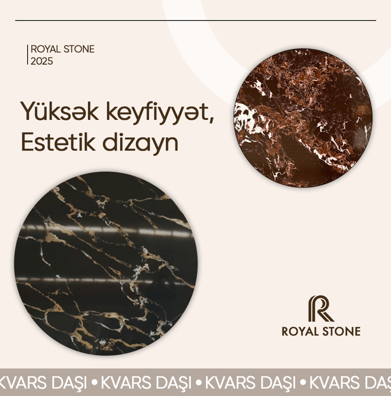 Biz yalnız beynəlxalq sertifikatlı kvars daşlarını ölkəmizə idxal edir və onları öz istehsal seximizdə yüksək dəqiqliklə emal edərək müştərilərimizə təqdim edirik.Royal Stone, müasir avadanlıqlar və peşəkar komanda sayəsində mətbəx səthləri, masaüstləri, hamam mebelləri, bar və reception masaları, pilləkənlər, dekorativ divar panelləri və müxtəlif interyer elementləri üçün estetik, davamlı və funksional həllər yaradır.